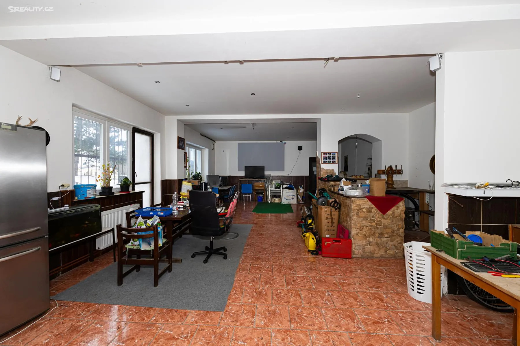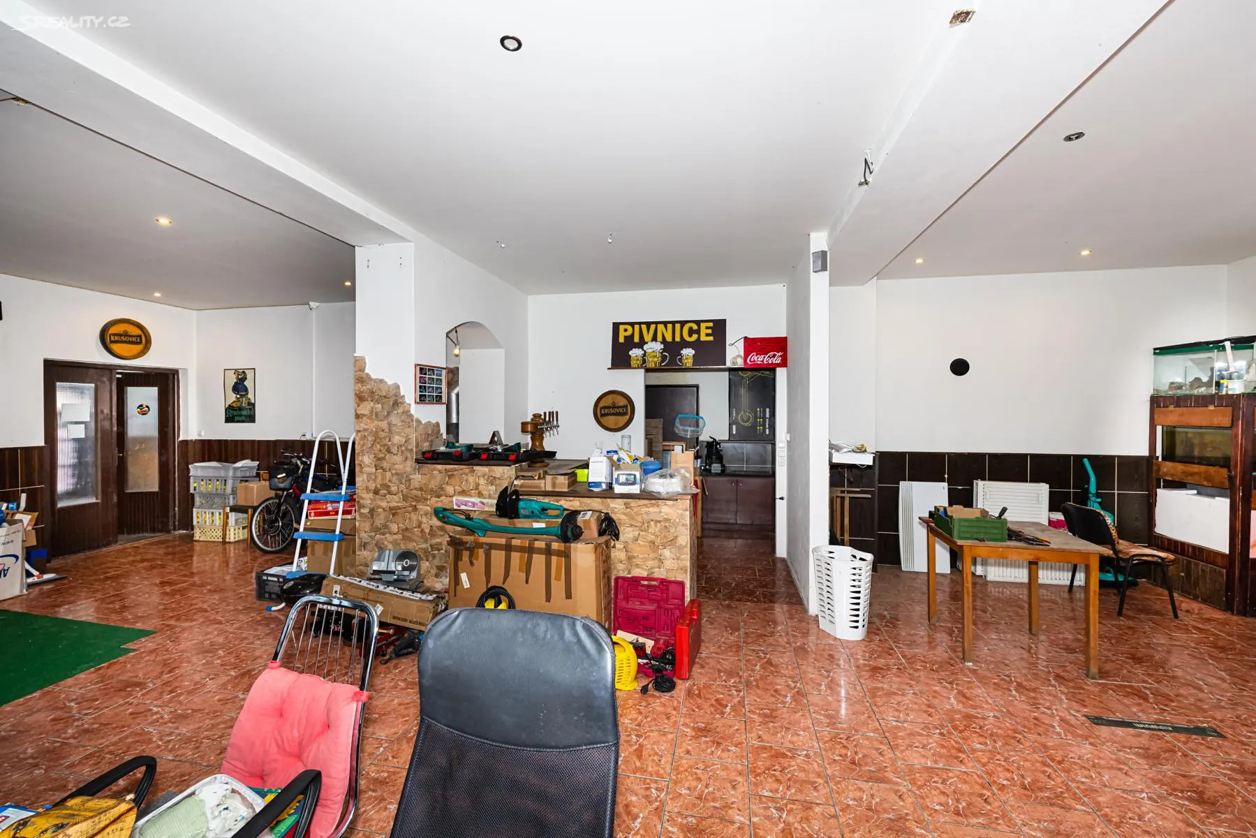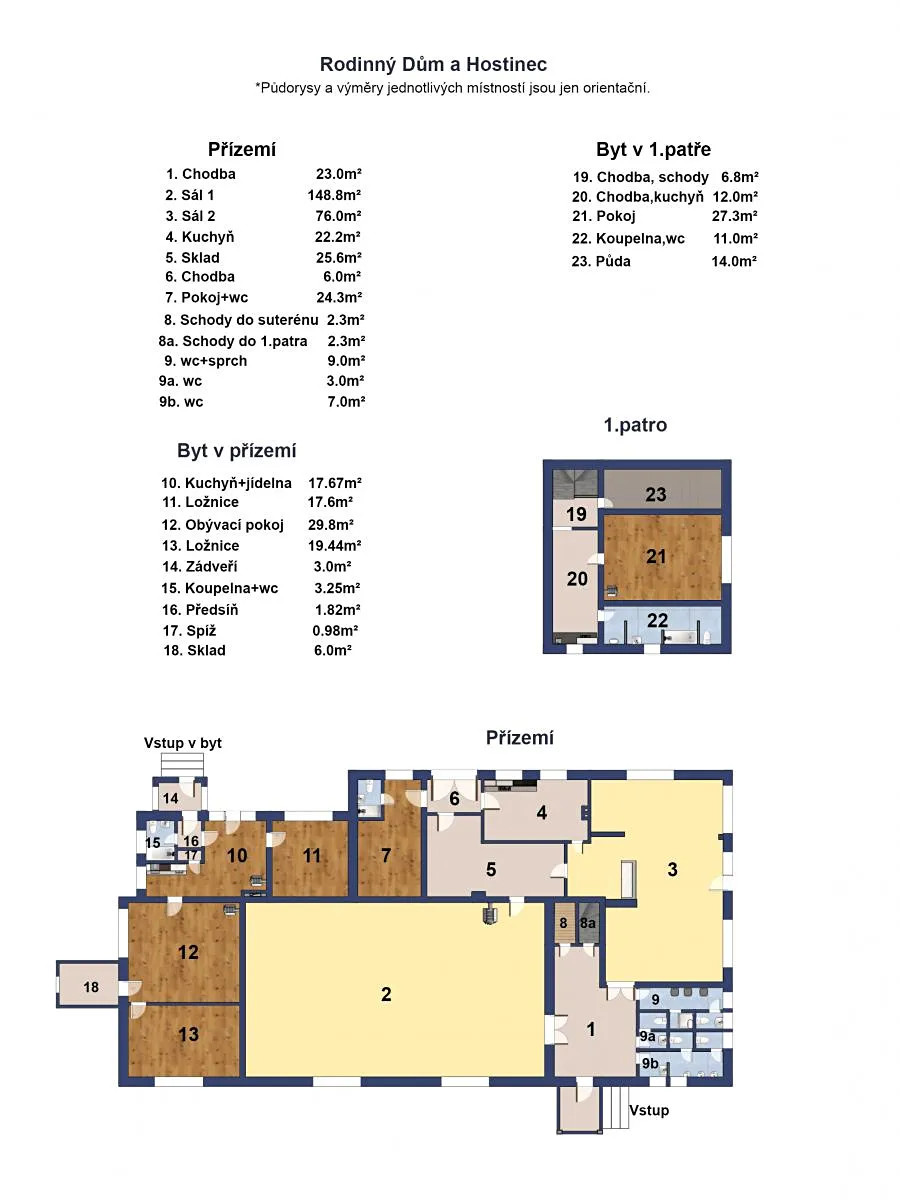 V přízemí objektu se nachází světlý prostorný sál s jižní orientací o ploše cca 150m2 se zachovalou dubovou parketovou podlahou a samostatný prostor výčepu, stavebně moderněji upravený, o velikosti cca 76m2, prostor kuchyně a většího příručního skladu spolu se sociálním zařízením a dvě samostatné bytové jednotky.