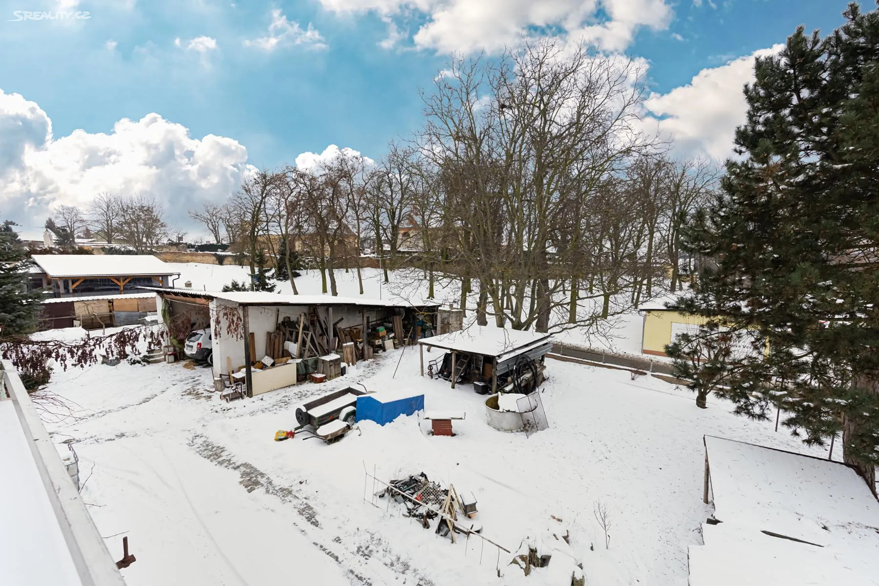 Na pozemku se nachází jednostranně otevřený přístřešek o ploše cca 100m2, v současnosti využívaný jako garážové stání.