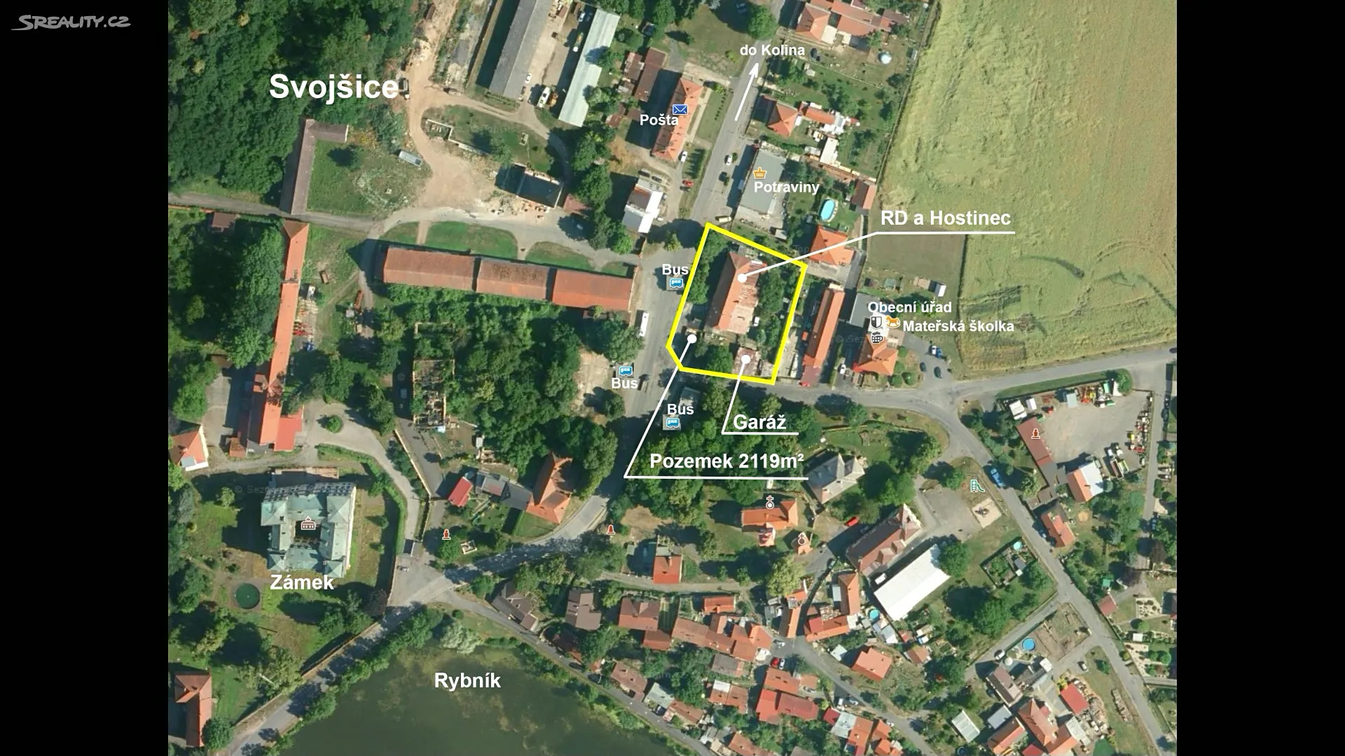Dům má dobré osazení na pozemku i v obci, je umístěn v centru obce, bezprostředně před domem se nachází zastávka hromadné dopravy, v těsné blízkosti jsou k dispozici obchod s potravinami, pošta, mateřská škola spolu s obecním úřadem.