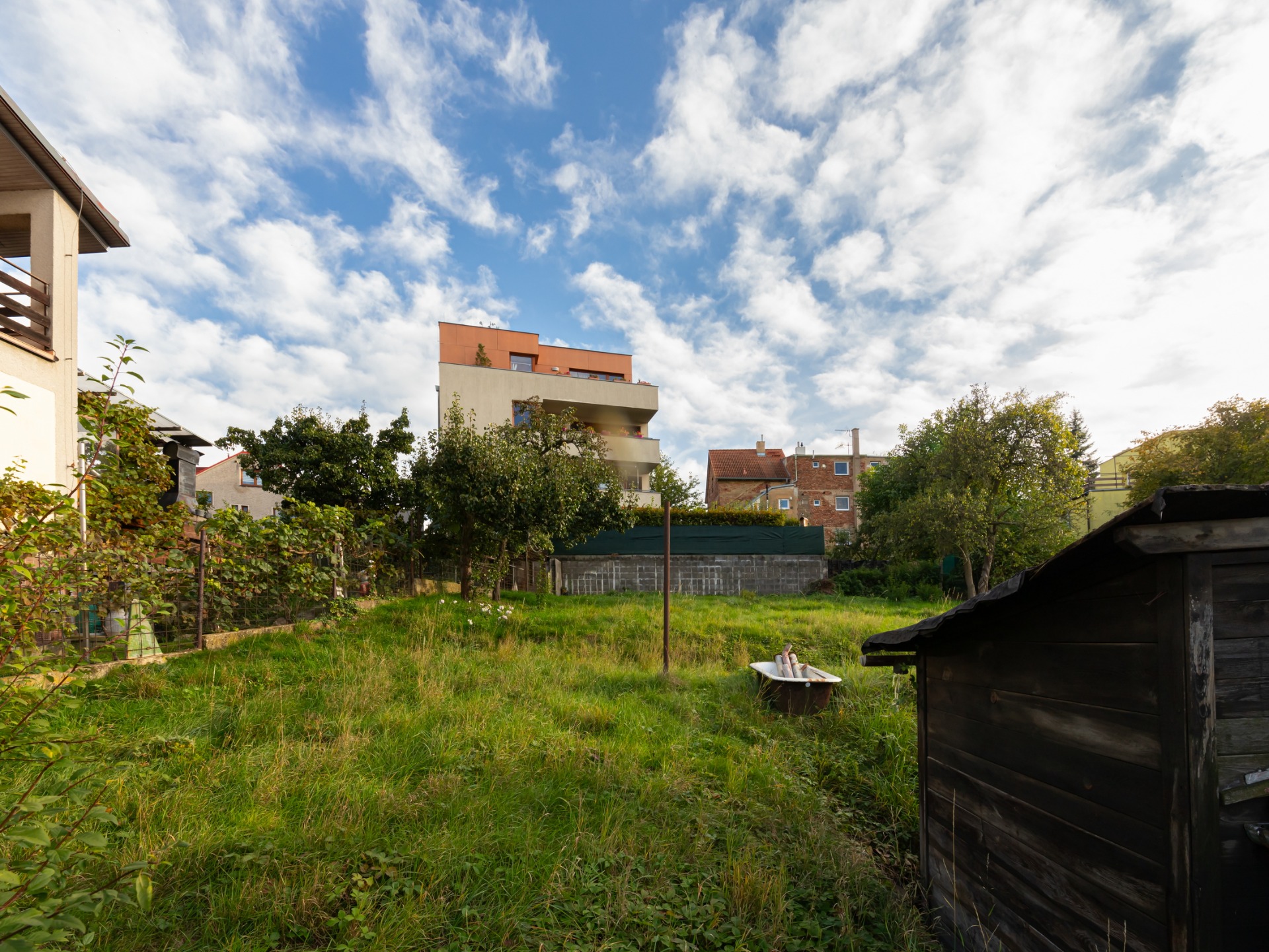 Na pozemku se nachází menší dřevěný objekt určený k odstranění, travní porost a několik vzrostlých dřevin a keřů.
